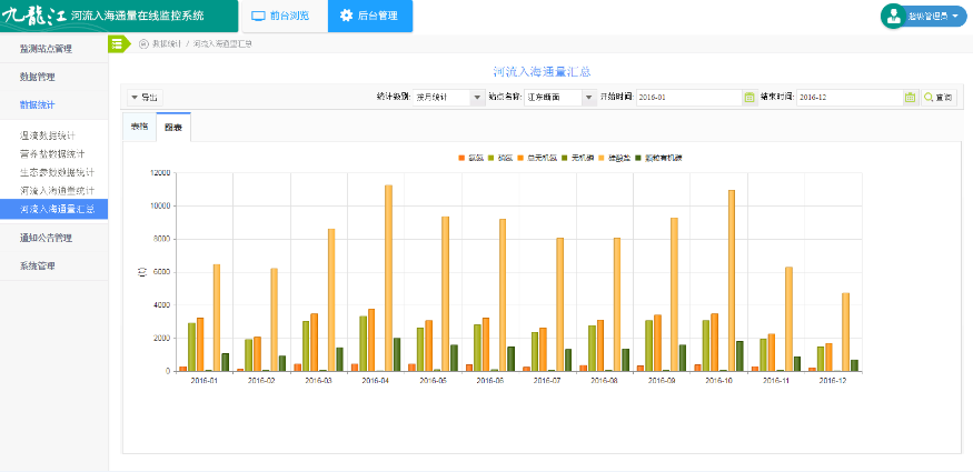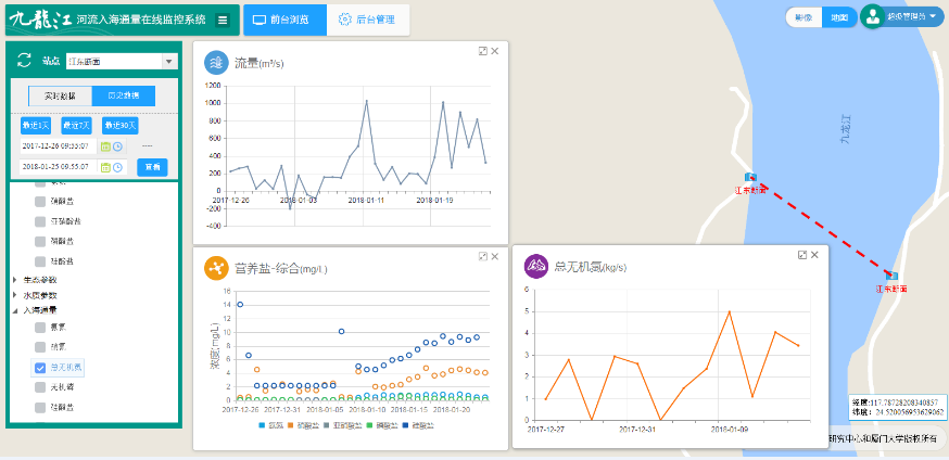 我司参与建设的“九龙江河流入海通量在线监控系统”完成对现场状况视频的实时获取,相关采样分析设备的数据对接,根据相应的规则对数据进行质量控制,结合LOADEST通量模型对现场状况进行及时分析,实现对实时数据及历史数据的管理与展示,利用相关统计模型实现对数据的统计等功能。